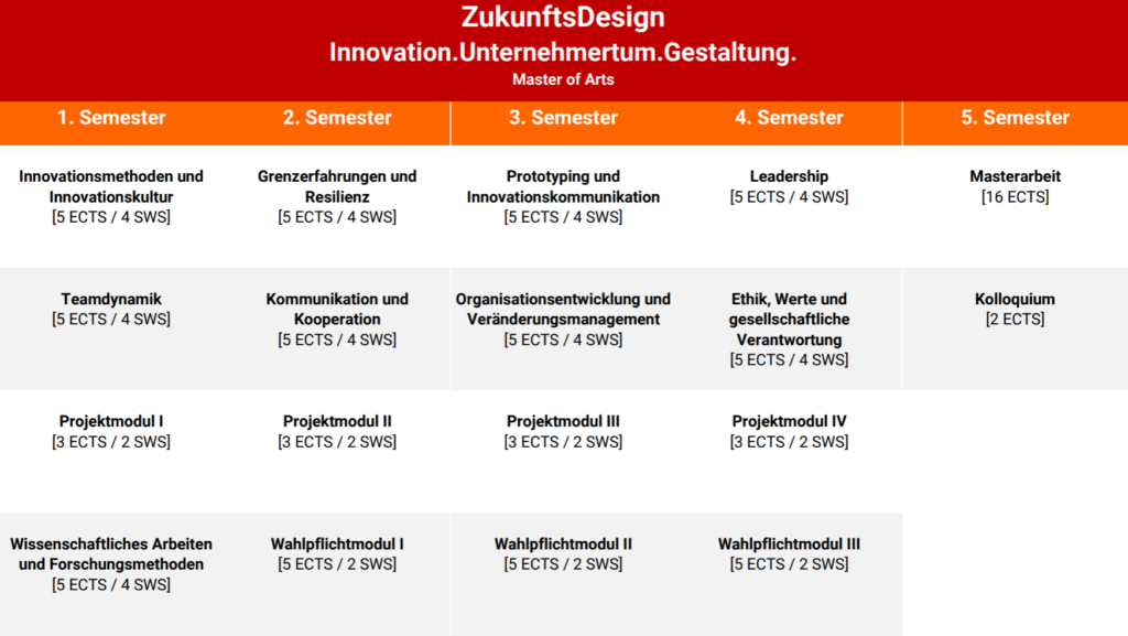 Das zentrale Lehrvehikel des Masterstudiengangs ZukunftsDesign sind die vier Semesterprojekte. Diese Projektmodule stammen direkt von den Studierenden oder von Partnerunternehmen aus der Region. Parallel bieten wir ein umfassendes Studienprogramm aus 8 Modulen an. Die Studiendauer beträgt 5 Semester und schließt nach Abgabe einer Masterarbeit mit dem akademischen Grad „Master of Arts“ ab.