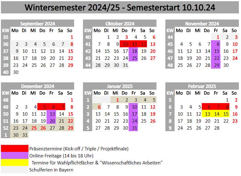 Das Masterprogramm ist als berufsbegleitendes Studium in einer Mischung aus Präsenz- und Online-Terminen konzipiert. Das Semester umfasst drei mehrtägige Blockveranstaltungen (Kickoff, Triple und Final), die jeweils von Donnerstag bis Samstag in Präsenz am Campus stattfinden (im Kalender rot gekennzeichnet).